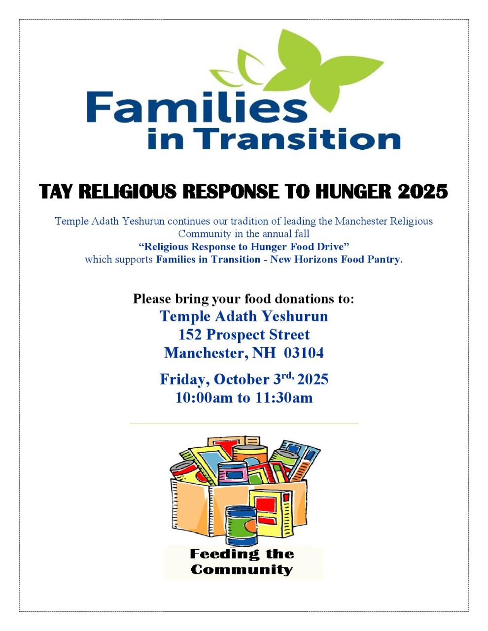 Bring your non-perishable food donations to TAY between Kol Nidre and Yom Kippur Day.