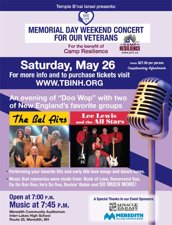 The performers will be The Bel Airs and Lee Lewis and the All Stars singing songs from the 50s and 60s. Camp Resilience, using the scenic beauty of the Lakes Region of New Hampshire as its backdrop and home base, provides sports, adventure activities and life skills programming for wounded warriors. The mission of Camp Resilience is to provide sustained, comprehensive programs to help wounded warriors recover their physical, mental and emotional well-being. The goals of Camp Resilience are to help veterans find meaning and purpose in life, develop strong family and community relationship skills, avoid and overcome destructive and addictive behavior, to make life count and then pass this on to others through the power of example. Tickets are $27.50 each and include complimentary refreshments (serving at 7:00 PM). Go to www.tbinh.org for tickets and information.