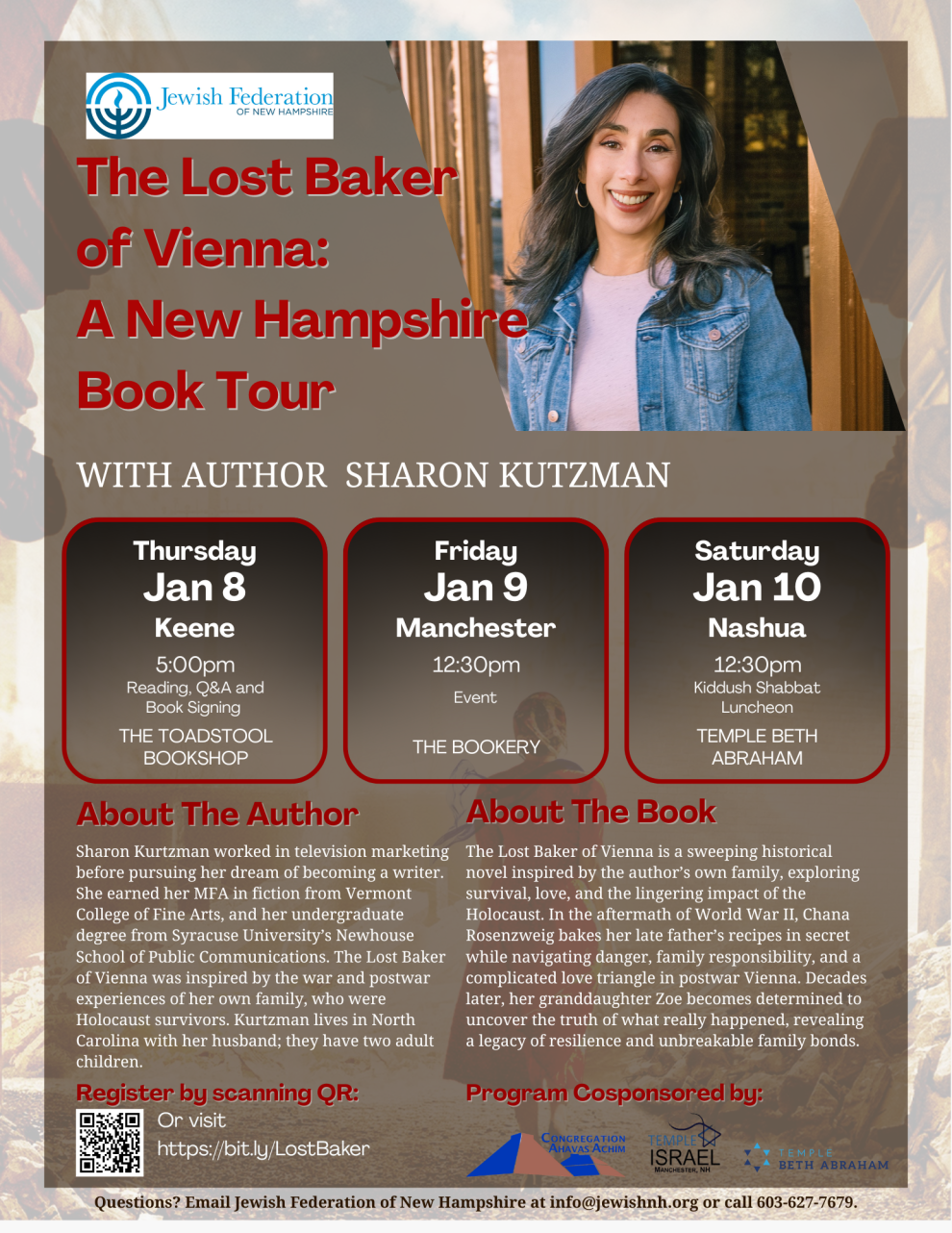 oin us at one of three opportunities to meet author Sharon Kutzman and discuss her book The Lost Baker of Vienna.