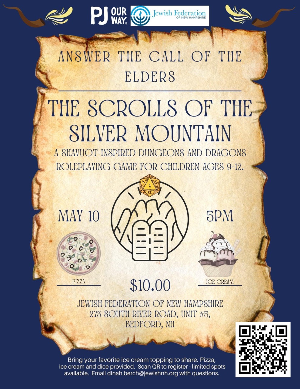 PJ Our Way kids aged 9-12 are invited to join Dinah and Allyson at the Jewish Federation of New Hampshire for Havdalah, Pizza and a Shavuot-inspired version of Dungeons and Dragons! Please bring your favorite ice cream topping to share - ice cream will be provided.