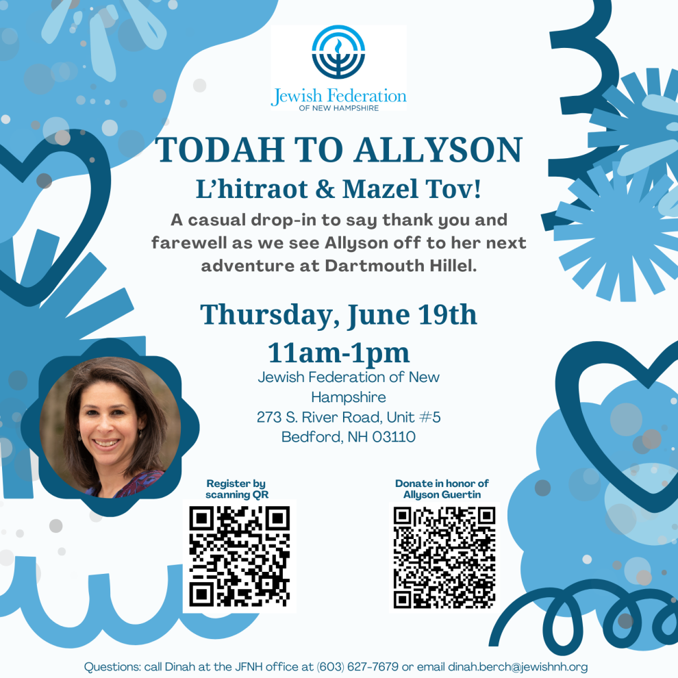 Join us for a casual drop-in to say thank you and farewell as we see Allyson off to her next adventure at Dartmouth Hillel.
