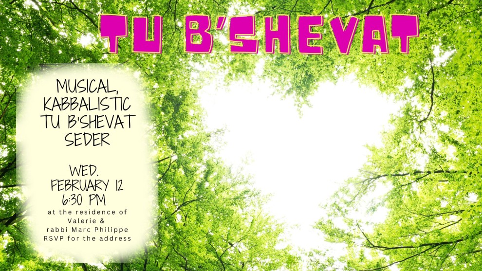 Musical Kabbalistic Tu B'Shevat Seder at the residence of Rabbi Marc Philippe and Valerie. Please RSVP for the address.