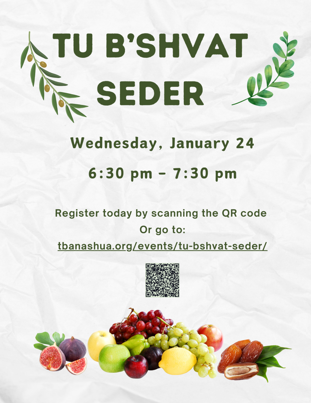 Join us as we celebrate Tu B'Shvat with a Seder! Readings, fruit sampling and great company! RSVP at tbanashua.org/events/tu-bshvat-seder/
