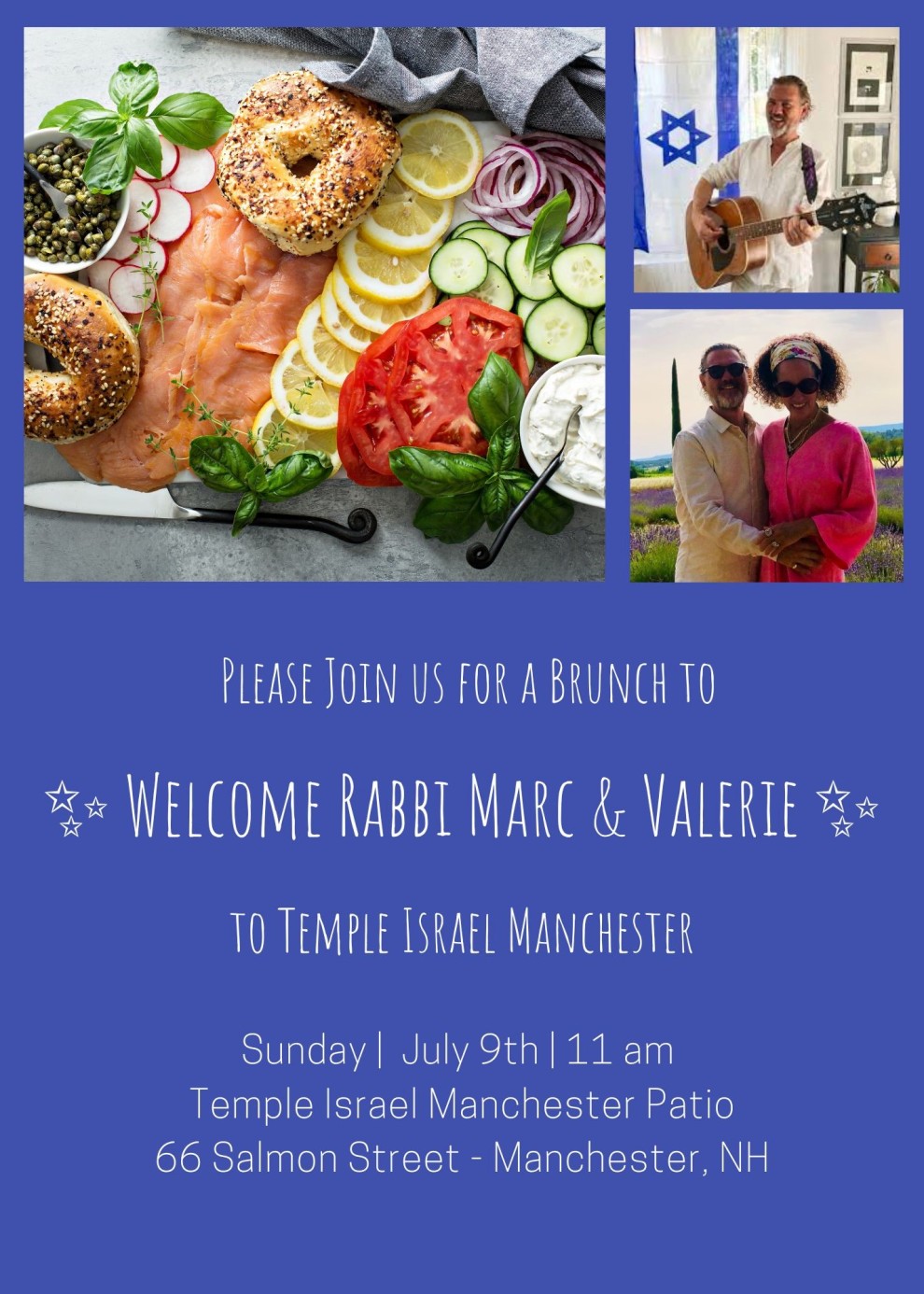 Please join Temple Israel in Manchester for a brunch to welcome their new rabbi Marc and his wife Valerie to their Temple Israel community.