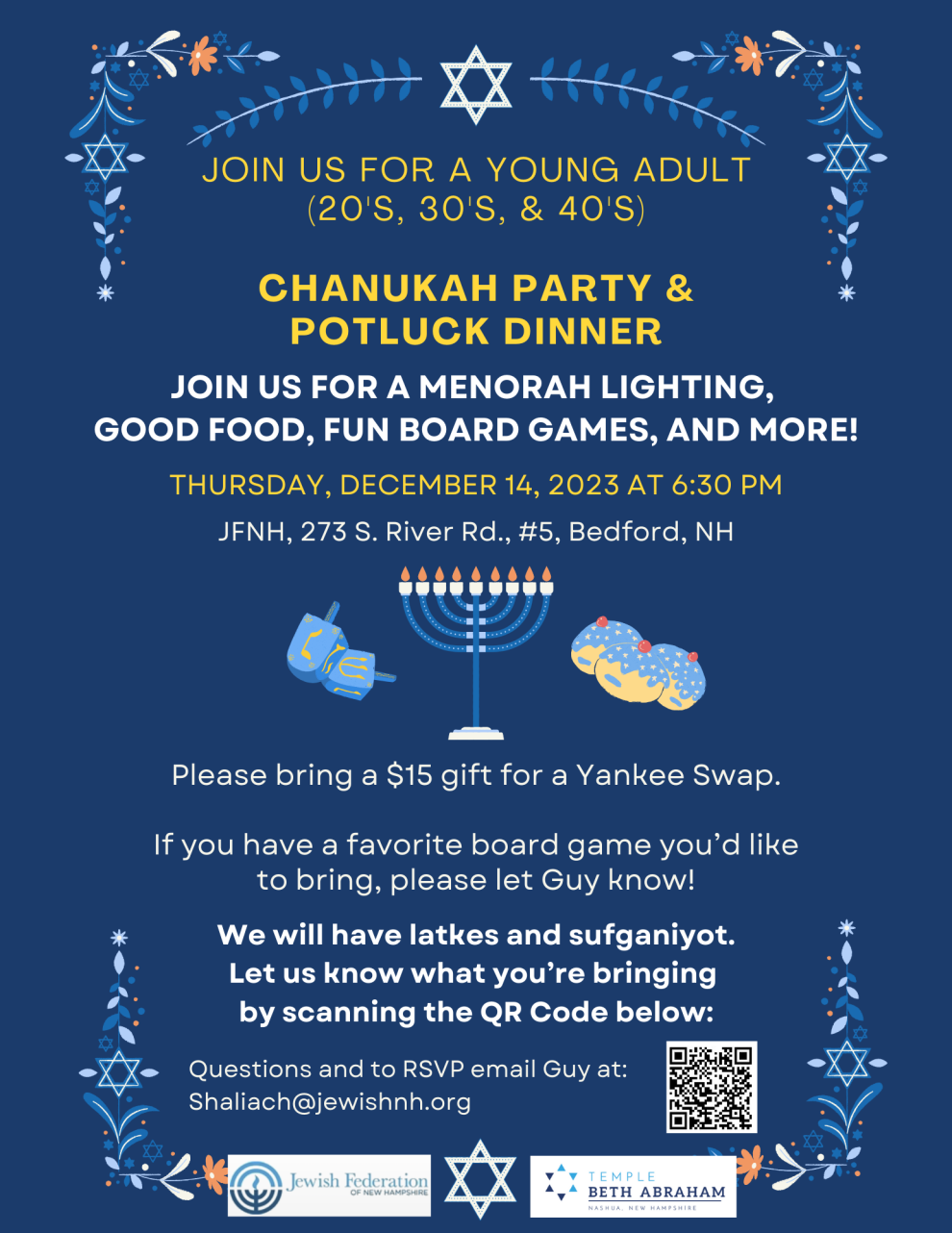 We're happy to invite you to the first young adult Chanukah party in New Hampshire!