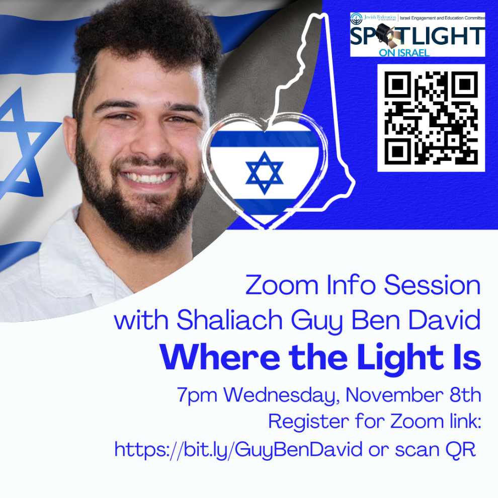 Jewish Federation of New Hampshire welcomes our current Shaliach Guy Ben David via Zoom. Guy will speak about what's happening right now in Israel and how to find the light at the end of the conflict.